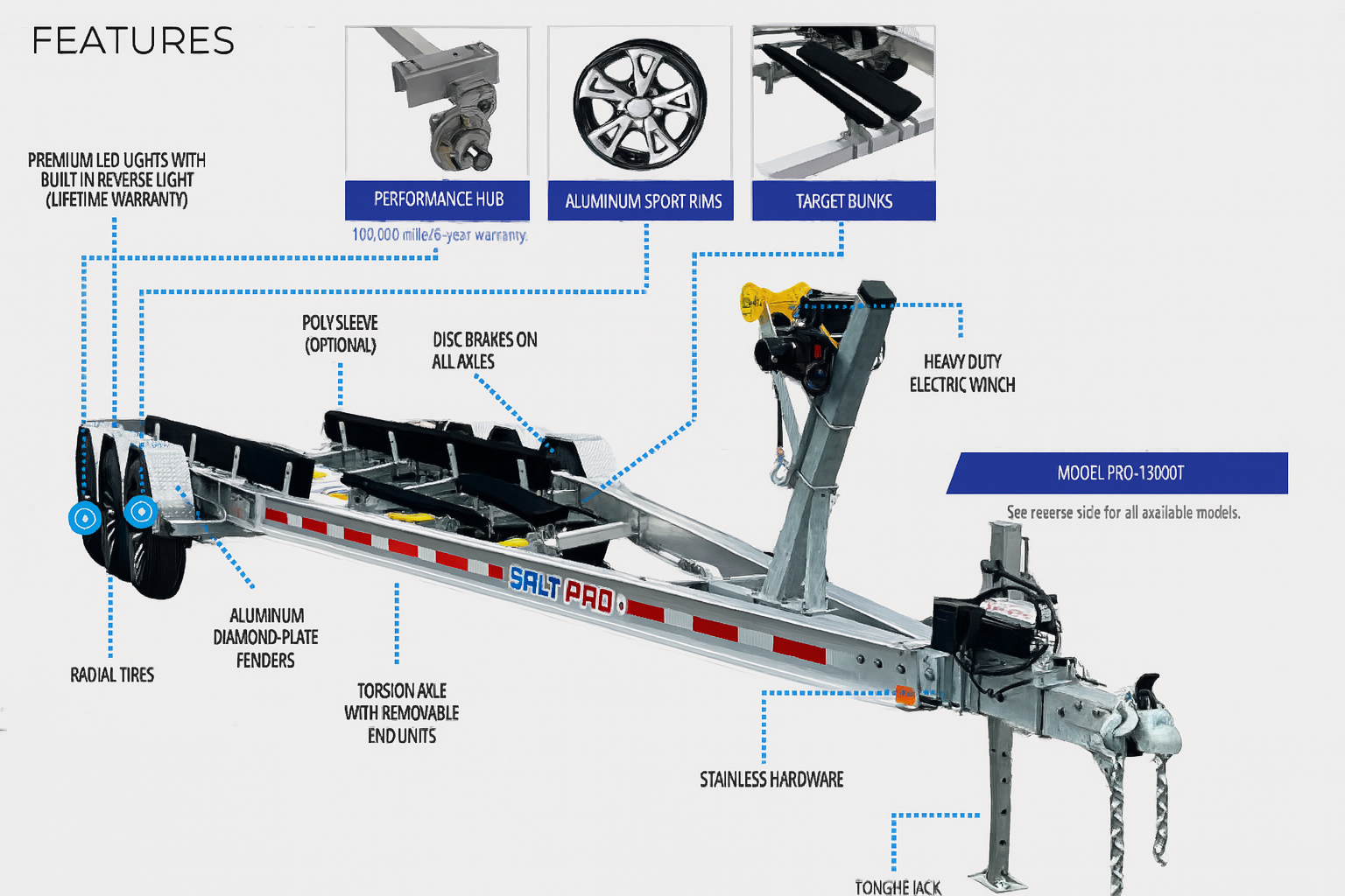 Engineered for premium performance and long-haul reliability, this SaltPro Elite trailer is fully loaded with high-end features and ready to carry boats up to 13,000 lbs with ease and stability.